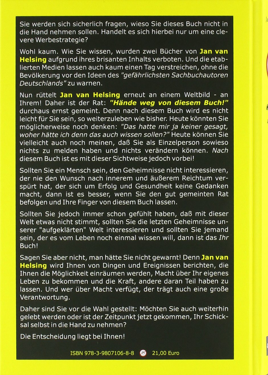 Nun rüttelt Jan van Helsing erneut an einem Weltbild - an Ihrem! Daher ist der Rat: "Hände weg von diesem Buch!" durchaus ernst gemeint. Denn nach diesem Buch wird es nicht leicht für Sie sein, so weiterzuleben wie bisher. Heute könnten Sie möglicherweise noch denken: "Das hatte mir ja keiner gesagt, woher hätte ich denn das auch wissen sollen?" Heute können Sie vielleicht auch noch meinen, dass Sie als Einzelperson sowieso nichts zu melden haben und nichts verändern können. Nach diesem Buch ist es mit dieser Sichtweise jedoch vorbei!